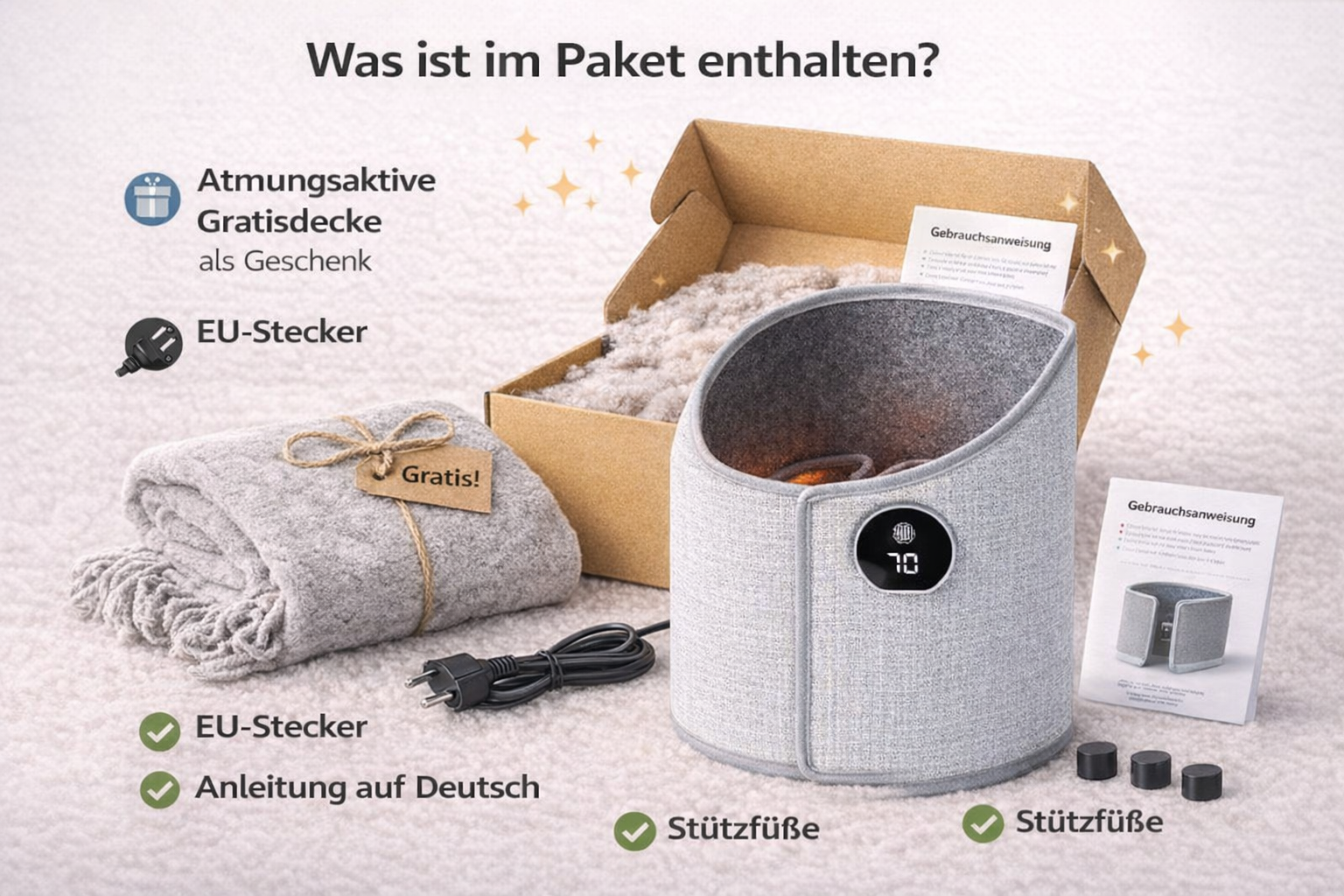 Im Paket enthalten: Fußwärmer, EU-Stecker, kostenlose atmungsaktive Decke und Anleitung in Deutsch.